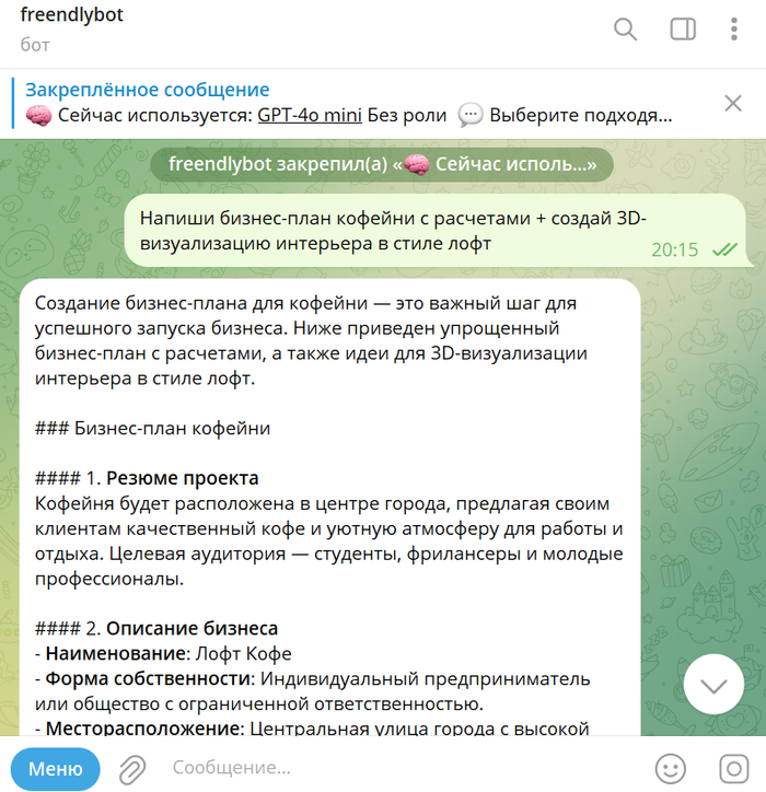 Пример запроса: *"Напиши бизнес-план кофейни с расчетами + создай 3D-визуализацию интерьера в стиле лофт"*