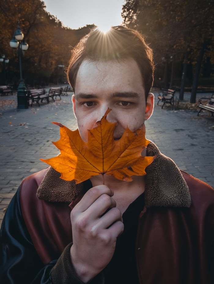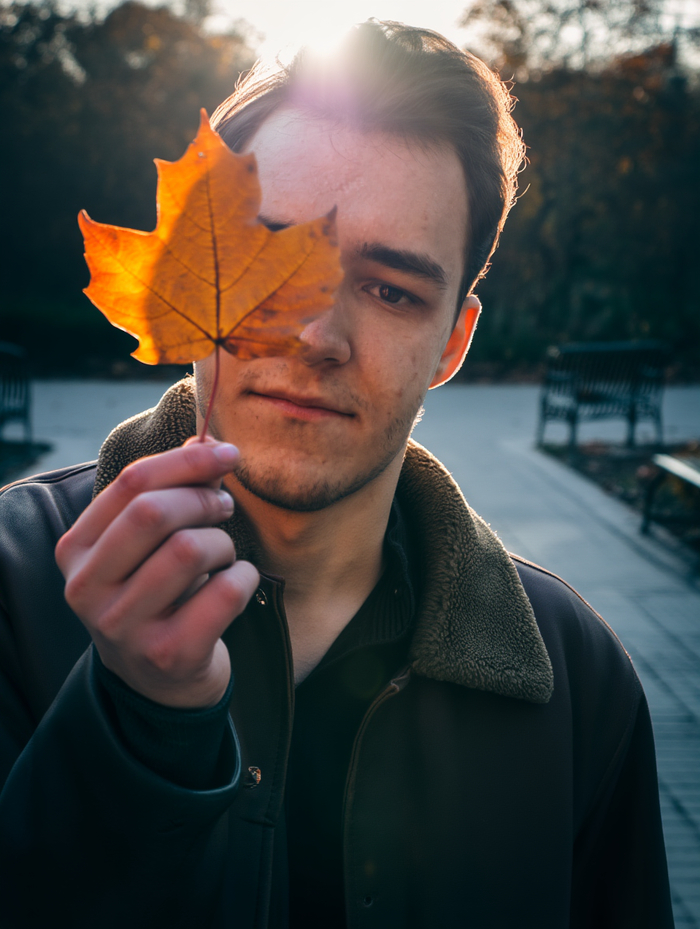 close-up photo of my face on the street; wearing the same clothes as in the photo; head facing directly towards the camera; looking straight ahead; sunny weather, sunset; I press an orange autumn maple leaf against my face with my right hand horizontally; leaf covers half of my face; in the background, you can see an autumn park with a grey pavement, lampposts and benches; background in the colours of late dark autumn; the sun directly behind my head, its rays visible, falling on me from behind directly into the camera and illuminating the edges of the leaf; the background is slightly blurred; my expression is calm, restrained, with a slight smile, and my gaze conveys depth