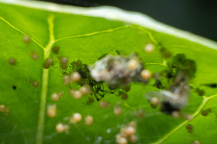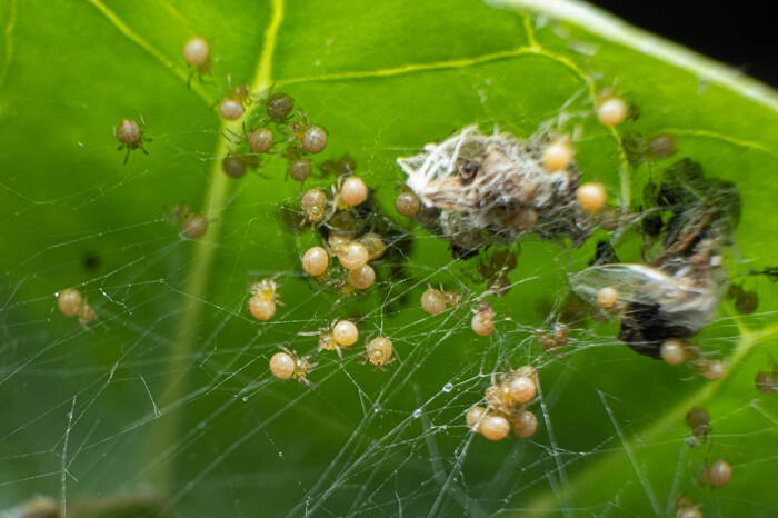 Сначала я конечно увидел эту многочисленную тусовку возле листика с безобразной спутанной паутиной. Потом подумал, ну что они одни что ли сидят тут. И правда - не одни :) Оказывается маманя тут как тут, рядом, под листочком. Присматривает значит... Наверняка это именно она и ломанулась заматывать добычу, когда та "удачно" прилетела к ним в гости.
