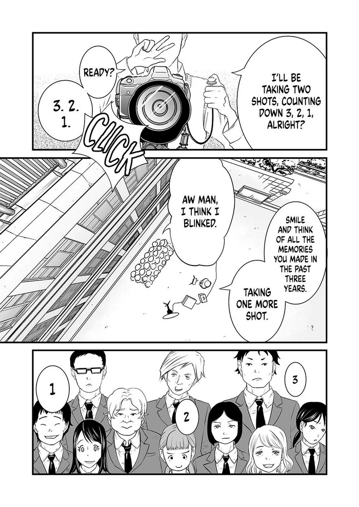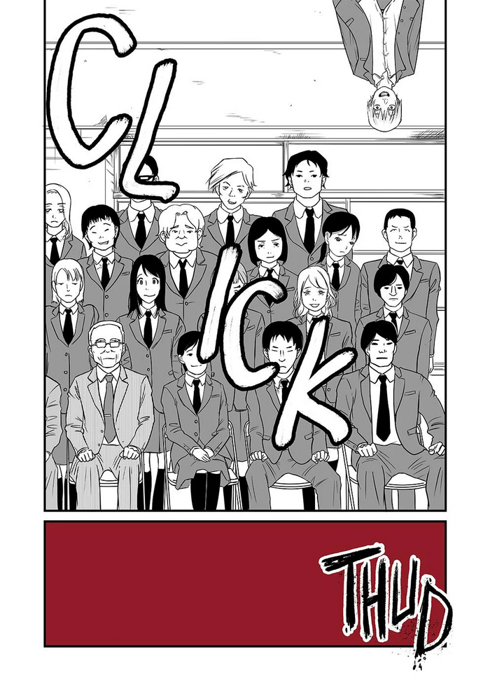 Зачем они так сделали? Прекрасный вопрос. Главный герой — Кей Куроно, не желает выглядеть плохо в глазах общества. Его друг Масару Като является законченным альтруистом и желает спасти всех на свете. Сцена заканчивается тем, что школьники попадают под колеса прибывшего экспресса. Тут произведение могло номинироваться на самую короткую мангу, но автор решил пойти далее. Начало после конца.