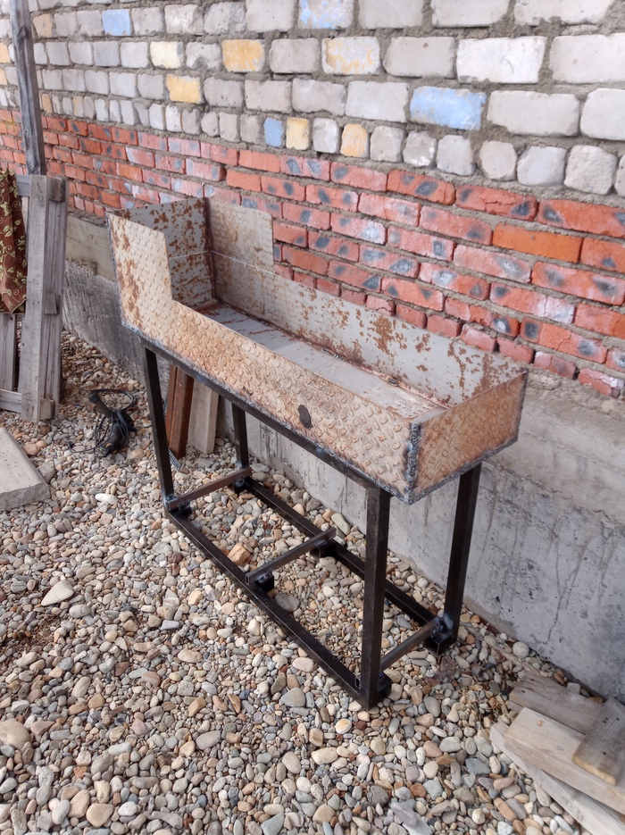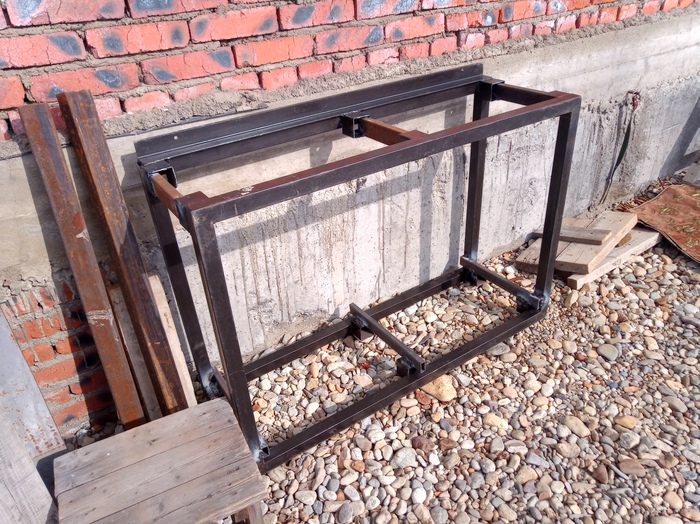 Подставка под мангал была найдена случайно в виде двойной рамы. Распилил её и расширил под ширину мангала тем что осталось от предыдущих работ.