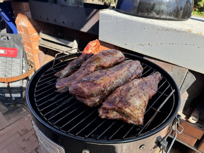 Итак, первым делом нам нужно растопить смокер. Как я уже сказал, использую для этого дубовые дрова. Сам процесс прост и понятен - открываем заслонки на трубе и на фаер боксе, закладываем дрова, разводим костер и ждем, когда все это дело разгорится. Далее нам нужно довести смокер до рабочей температуры, той, при которой мы планируем готовить наше блюдо. Сегодня у меня это 130 градусов. Далее нам необходимо следить за тем, чтобы в фаербоксе были дрова, чтобы они горели и чтобы температура была в пределах нужной. Температуру регулируем заслонками - пошла вниз, значит заслонки надо приоткрыть (и/или добавить дров), пошла вверх - наоборот прикрываем заслонки, уменьшая подачу кислорода. Следить нужно постоянно, ровная температура является важным моментом при приготовлении на смокере.