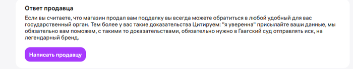 "Если вы считаете, что магазин продал вам подделку вы всегда можете обратиться в любой удобный для вас государственный орган. Тем более у вас такие доказательства Цитируем: "я уверенна" присылайте ваши данные, мы обязательно вам поможем, с такими то доказательствами, обязательно нужно в Гаагский суд отправлять иск, на легендарный бренд."