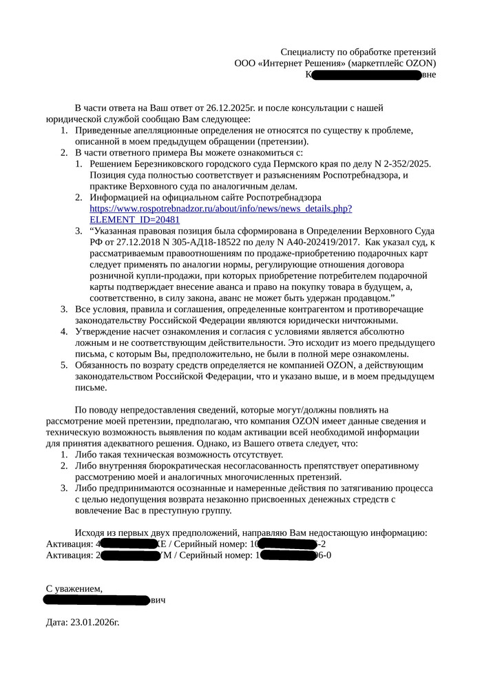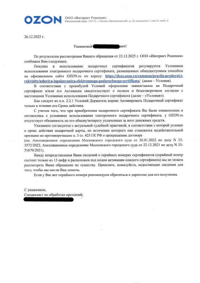 26 декабря 2025 г. и 29 января 2026 г. ООО «Интернет Решения» отказало в удовлетворении требований, ссылаясь на пункты 2.2.1 «Условий использования электронного подарочного сертификата», размещенных на сайте OZON.ru, и утверждая, что оформление заказа на сертификат свидетельствует о согласии с условиями, включая невозможность возврата средств по истечении срока действия.