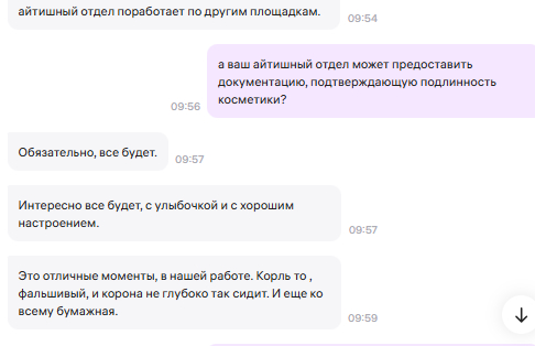 После этого я начала переписку с продавцом и запросила документы, подтверждающие подлинность продукции. (Также мною был направлен запрос деклараций соответствия в адрес Вайлдберриз.