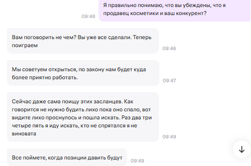 "Если вы считаете, что магазин нарушает ваши права, вы всегда можете обратиться в любой удобный для вас государственный орган. Там и познакомимся, что за конкурент, так яро следит за нашей деятельностью, сегодня откроем еще пару складов, не переживайте, скоро все будет хорошо. Московский склад заполнят, и дальний восток откроют. Больше улыбайтесь, и не нервничайте."