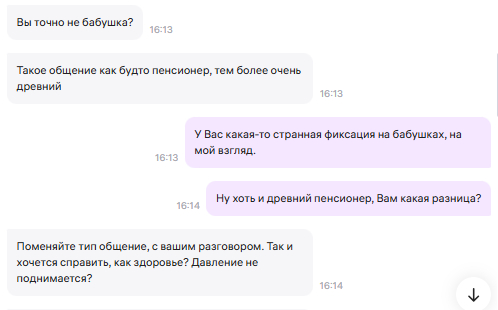 "Вы точно не бабушка? Такое общение как будто пенсионер, тем более очень древний"