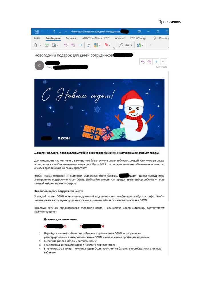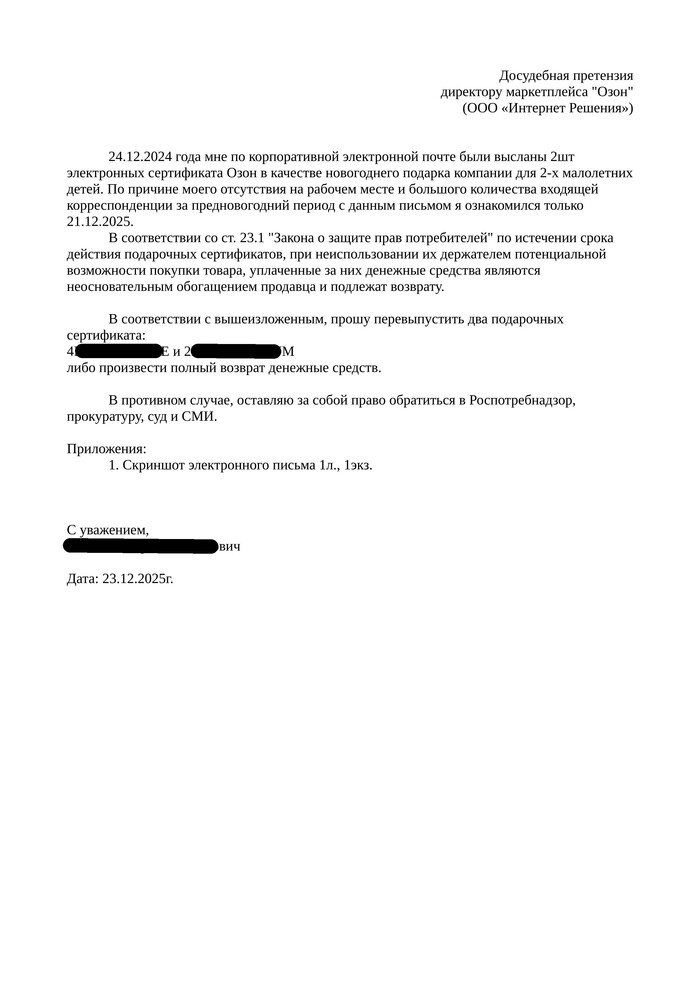 24 декабря 2024 г. мне по корпоративной электронной почте были направлены два электронных подарочных сертификата OZON (коды активации: 4FХХХХХХХХХE и 2ХХХХХХХХХYM) в качестве новогоднего подарка для несовершеннолетних детей от работодателя. В связи с отсутствием на рабочем месте в праздничный период и большим объемом корреспонденции я ознакомился с данным письмом только 21 декабря 2025 г., когда срок действия сертификатов уже истек.