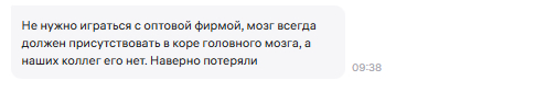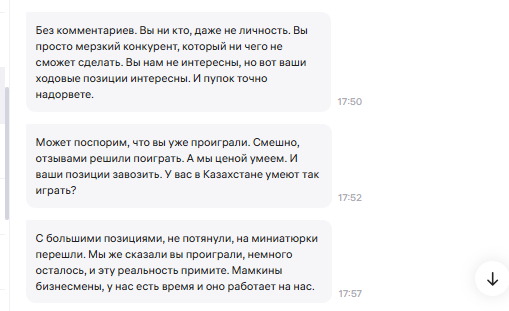 "Без комментариев. Вы ни кто, даже не личность. Вы просто мерзкий конкурент, который ни чего не сможет сделать. Вы нам не интересны, но вот ваши ходовые позиции интересны. И пупок точно надорвете. Может поспорим, что вы уже проиграли. Смешно, отзывами решили поиграть. А мы ценой умеем. И ваши позиции завозить. У вас в Казахстане умеют так играть? С большими позициями, не потянули, на миниатюрки перешли. Мы же сказали вы проиграли, немного осталось, и эту реальность примите. Мамкины бизнесмены, у нас есть время и оно работает на нас."