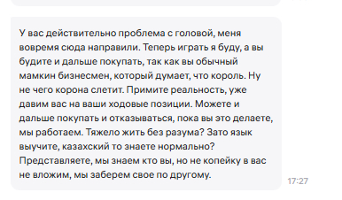 "У вас действительно проблема с головой, меня вовремя сюда направили. Теперь играть я буду, а вы будите и дальше покупать, так как вы обычный мамкин бизнесмен, который думает, что король. Ну не чего корона слетит. Примите реальность, уже давим вас на ваши ходовые позиции. Можете и дальше покупать и отказываться, пока вы это делаете, мы работаем. Тяжело жить без разума? Зато язык выучите, казахский то знаете нормально? Представляете, мы знаем кто вы, но не копейку в вас не вложим, мы заберем свое по другому."