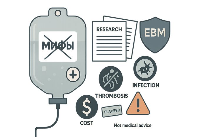 Даже если считать, что вводимые препараты - просто плацебо, стоит помнить, что любая капельница — инвазивная процедура. Недостаточная стерилизация оборудования, нарушение правил асептики и антисептики могут стать причиной тяжелых инфекционных осложнений. Другие побочные эффекты в месте постановки катетера - гематомы, тромбозы, абсцессы и некроз кожи.