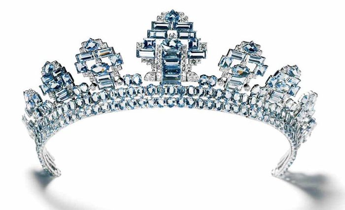 Аквамарины также часто использовались в тиарах, включая аквамариновую и бриллиантовую тиару от Cartier (внизу), которая была одной из 27 тиары, созданных ювелиром для коронации Георга VI в 1937 году. Изготовленная из платины тиара украшена аквамаринами, а также круглыми бриллиантами. Неудивительно, что аквамарин продолжает вдохновлять ювелиров на создание необычных украшений.