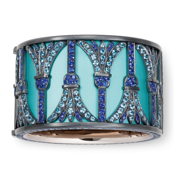 Браслет от Hemmerle в стиле фараонов из алюминия, серебра и белого золота с аквамаринами и сапфирами.