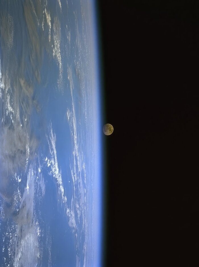6. На этом снимке, сделанном астронавтом во время полета шаттла STS-103, открывается невероятный вид на Землю во время восхода Луны.