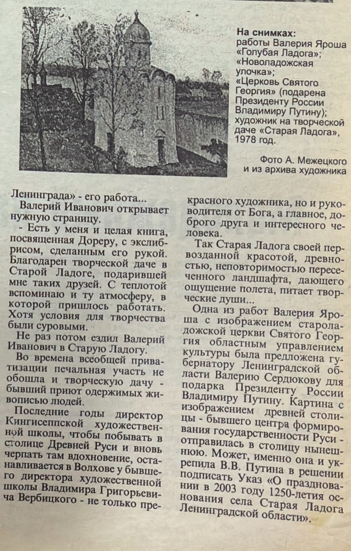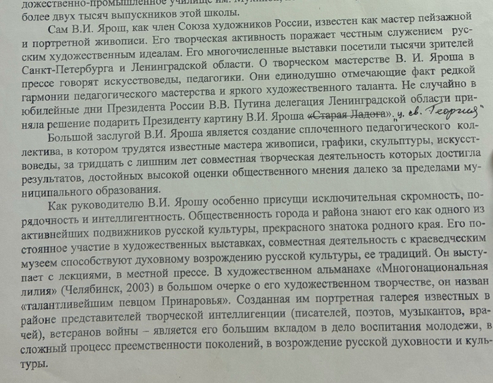«Вчера (25 января) я побывал на выставке картин Яроша В.И. Да давно я не видел такого. Картины были наполнены таким разнообразием цветов. Особенно меня поразили картины с изображением деревни. Я действительно очень горд, что меня учит семья Ярошей. Это всё равно, что учиться у Левитана или Брюллова. Пусть я не стану живописцем, портретистом или ещё кем-нибудь, но я буду благодарен им, что они меня научили чувствовать и понимать природу. И это гигантская удача, что я учусь у этих гениальных людей. Я действительно хочу уметь понимать, чувствовать природу, знать её законы цвета, теней, тонов. Когда я смотрел на его картины мне казалось, что я входил в мир красок, тонов, теней».