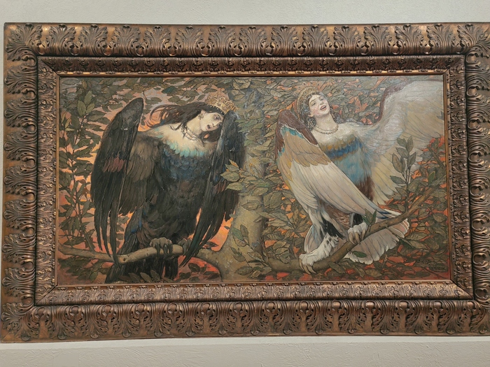 А после отдыха мы пошли на выставку Васнецовых, и насколько же это была исцеляющая выставка, бальзам на душу. Все картины, знакомые с детства, предстали перед нами вживе. И они оказались ОГРОМНЫЕ. Я понятия не имел, что Три Богатыря, полет на ковре-самолете, Добрыня и камень, Аленушка, Иван-Царевич и серый волк такие громадные полотна. Сирин и Алконост размером примерно как полтора меня каждая не дадут соврать.
