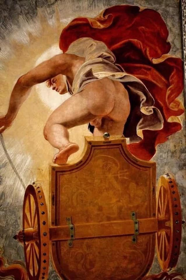 Это фрагмент росписи потолка на вилле "Палаццо дель Те" (1525-1535 гг) в городе Мантуя в Италии. Уже не первое столетие учёные и другие специалисты пытаются определить - кто же изображён на фреске. Проблема в том, что ракурс не слишком удачный. Фреска качественная и все детали хорошо прописаны, но лицо разглядеть пока не удаётся. Большинство таки склоняется к тому, что на фреске изображён Фаэтон, но это неточно.