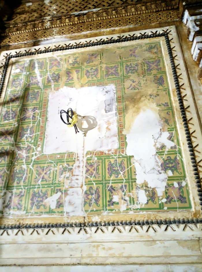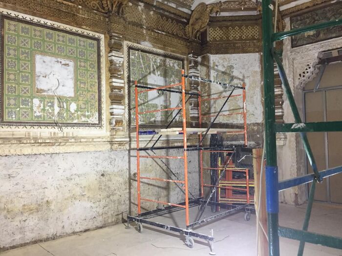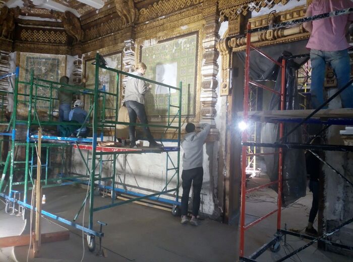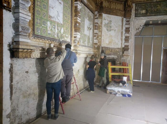 Во время нашей реставрации в 2019 году нам рассказывали о мистике и призраках, якобы обитающих в этом зале. Однако, за все время своих наблюдений я не столкнулся со сверхъестественными явлениями. Но, при первом визуальном осмотре я, однако, обнаружил множество трещин в красочном слое и грунте на рельефах и скульптурах интерьера. Зал был покрыт толстым слоем пыли и различных загрязнений, а на росписях и орнаментах можно было заметить многочисленные красочные брызги.