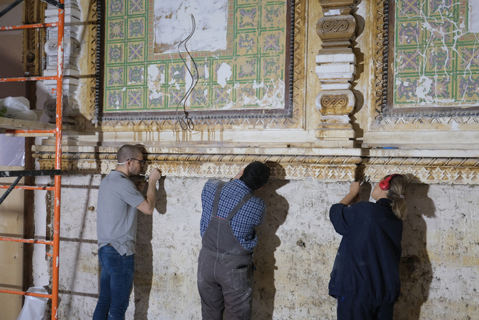 Следующим этапом стало подготовка поверхности всех рельефов к финальным тонировкам. Мы провели много времени, подбирая образцы цвета, стремясь к тому, чтобы тонировка была неотличима от оригинального авторского решения. После того как идеальный образец был найден, мы принялись за тонировку всего интерьера, уделяя внимание каждой детали.