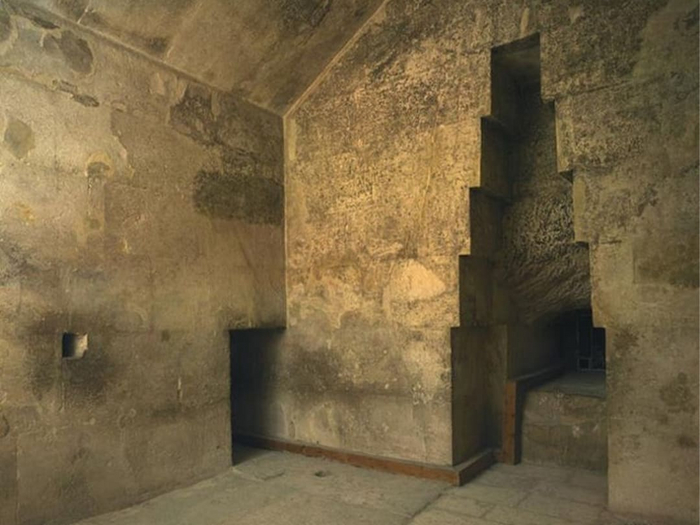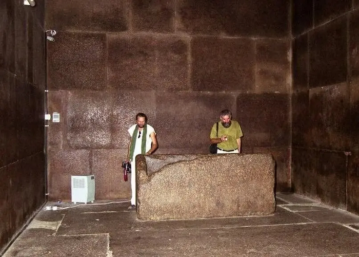 Никакого фараона, конечно же, тут нет. Только его каменный саркофаг без крышки. Помещение, как и Большая галерея, облицована гранитом бурого цвета. На стенах нет никаких росписей и украшений. Не очень похоже на последнее пристанище могущественного фараона древности...