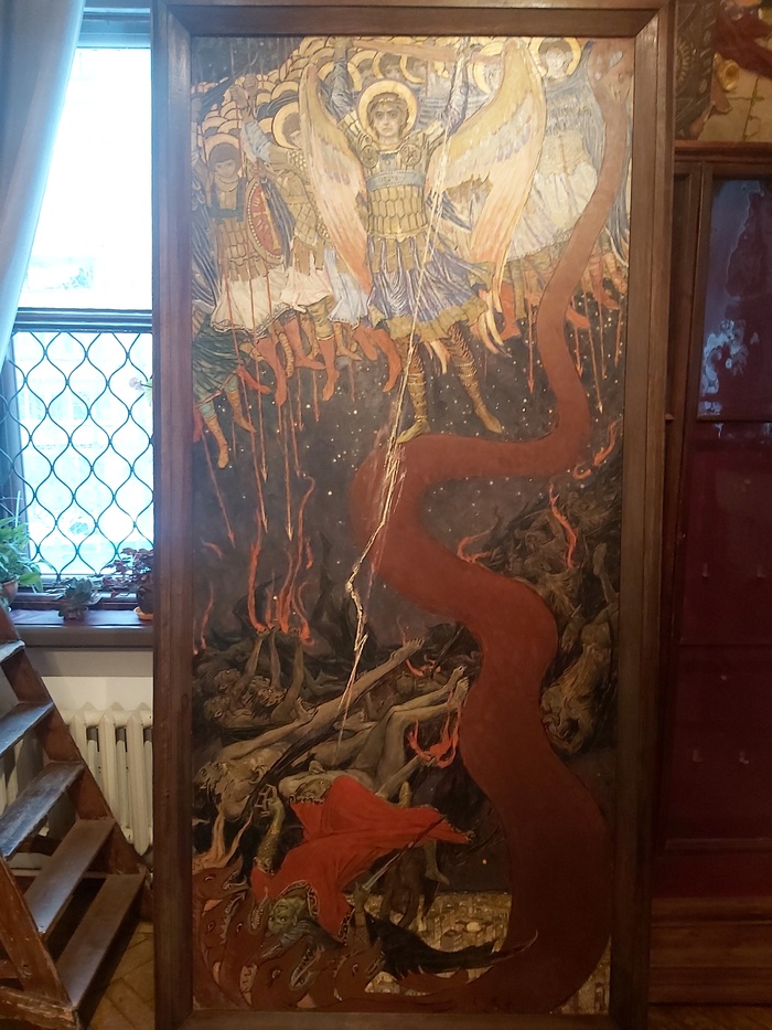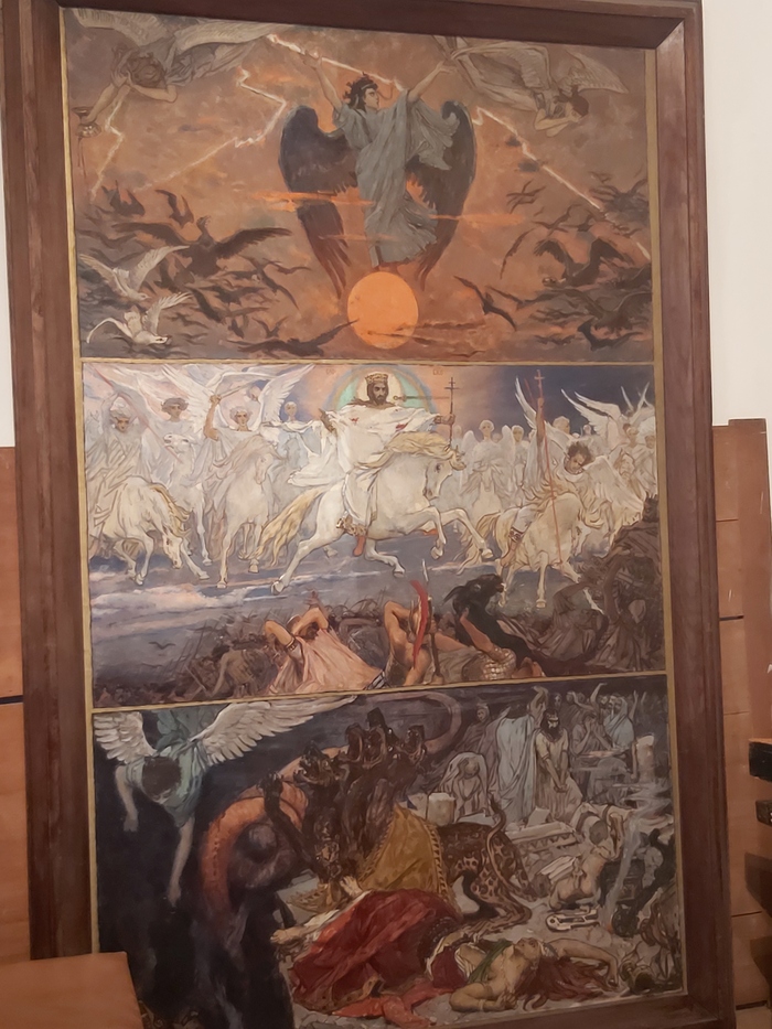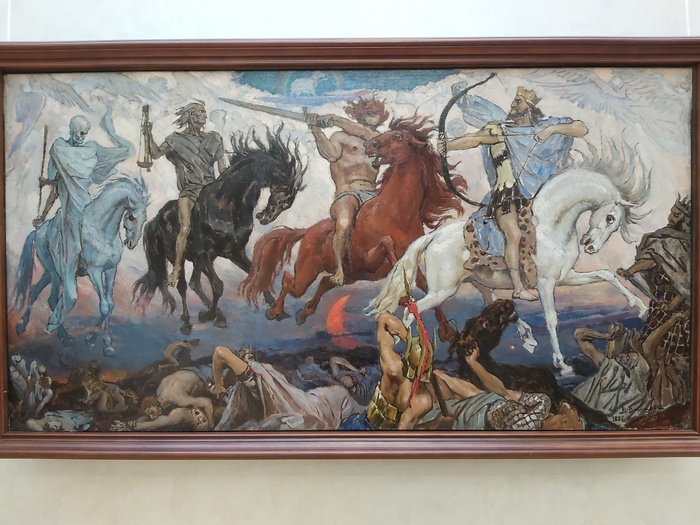 "Всадники Апокалипсиса" (1887, ГМИР) представляют собой один из эскизов к неосуществленной росписи плафона Владимирского собора в Киеве. Две другие - "Апокалипсис" и "Архангел Михаил" (1915) иллюстрируют текст Откровения Иоанна Богослова, при этом трехчастный "Апокалипсис" (1889) также является эскизом к росписи того же собора. Обе вещи хранятся в Доме-музее В.М. Васнецова в районе Проспекта Мира в Москве, меж работ сказочного цикла. И эта живопись для меня выглядит совершенно иной, наполненной невероятным внутренним напряжением, тем самым контрастируя со сказочные эпизодами.