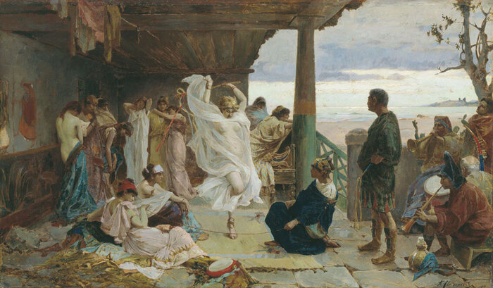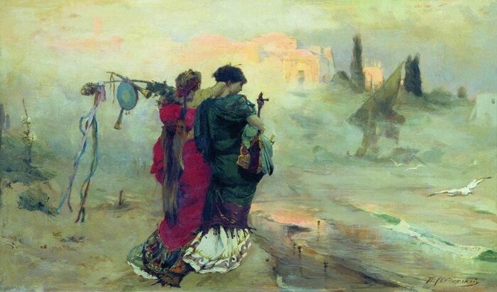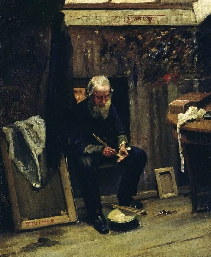 В то время, когда я познакомился с ним, ему было за семьдесят лет. Определен он был в Академию ребенком и, дойдя до натурного класса, занял место помощника профессора, а затем, как лучший ученик, был отправлен за границу. Живя в Италии, Егоров прославился как композитор и рисовальщик. Канова, Каммучини знали его и ценили; папа предлагал ему сделаться его придворным живописцем; но Егоров, как патриот и к тому же религиозный человек, не захотел изменить своему отечеству… Тогдашние любители живописи дорого платили за его рисунки. В моем собрании их семьдесят два, из которых особенно интересны два рисунка, сделанные в Италии, изображающие борющихся гладиаторов, а затем рисунок с натуры мужской фигуры в ракурсе… Об этом рисунке Алексей Егорович рассказал мне следующее. Приехав в Италию, он отправился в натурный класс, где спросили его, умеет ли он рисовать, и, получив от него ответ, что умеет, допустили в класс, где все места оказались занятыми; и ему пришлось поместиться кое-как под выставленной фигурой. Егоров в полчаса набросал всю фигуру, положил в папку, встал и начал ходить по классу, посматривая на чужие рисунки. На него обратили внимание и спросили: почему он не рисует. "Да я уже кончил", - ответил Егоров. Посмотрели рисунок – и удивились его мастерству; слава о нем как о большом мастере распространилась. Италию и итальянцев Егоров очень любил и вспоминал о них с удовольствием… Обстановка Егорова была скромная. Со старостью заказы сократились, а расходы увеличились. Лишившись места в Академии, А. Е. должен был платить за квартиру, покупать дрова, снабжать выросшего сына деньгами; дочери вышли замуж, и явился новый расход на них. Приходилось ограничивать себя, и милый профессор сам закупал сальные свечи, сам их заправлял в подсвечники; еда его была простая. Случайно узнал я от сына, Евдокимушки, что отец его поет и хорошо играет на гитаре и балалайке; при этом Вера Ивановна подосадовала на Евдокимушку, что тот выдал забаву отца на таком неблагородном инструменте. Я стал упрашивать Алексея Егоровича сыграть и спеть что-нибудь; он отнекивался, говоря, что неприлично играть на мужицком инструменте. Однако мне удалость уговорить старика, и он, взяв балалайку, сел у растворенного окна и взял несколько аккордов. Вечернее солнце садилось и окрашивало осеннее небо... Взяв еще несколько аккордов, он, шутя, запел, подыгрывая: