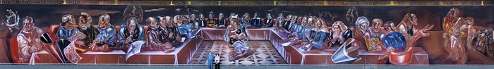 Панно «Консилиум великих врачей» это монументальное произведение, созданное специально для холла института художниками Леонидом Полищук и Светланой Щербининой. Дело было в 1988 году и конечно для того времени сюжет и исполнение очень смелые.