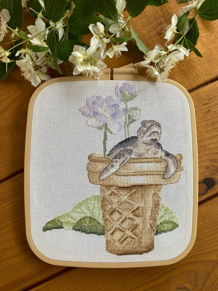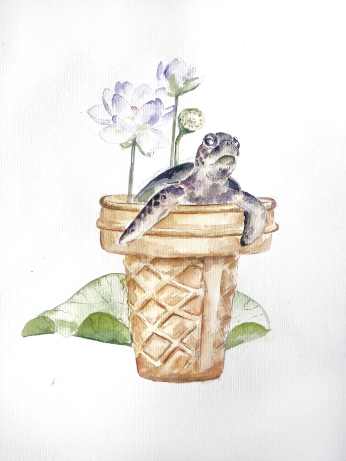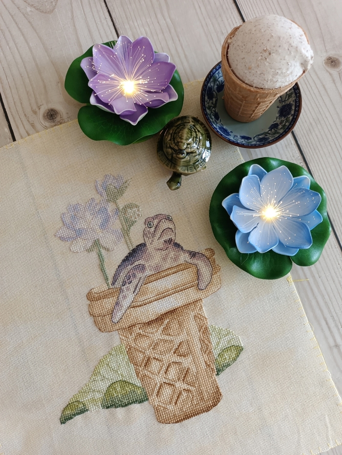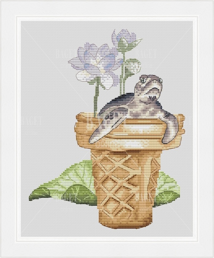 В далёком 2022 году я участвовала в челлендже, сутью которого надо было совместить несовместимое. Меня захватила эта идея. В итоге появились кролик, спящий в белой чашке в окружении пионов, мышка, захватившая стаканчик кофе и ещё много других. В том числе эта черепашка.