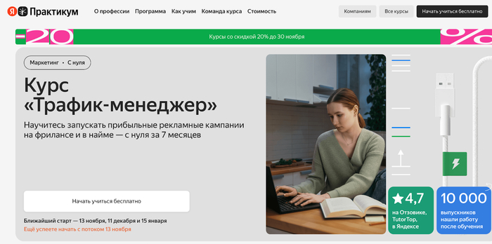 Материалы подаются простым языком и помогают последовательно разбираться в стратегии, рекламных кампаниях и аналитике. На курсе есть поддержка экспертов из крупных компаний, помощь с трудоустройством и возможность учиться в удобном графике. После окончания выдаётся диплом о профпереподготовке, а выпускники получают больше приглашений на собеседования и лучшие предложения на старте карьеры.
