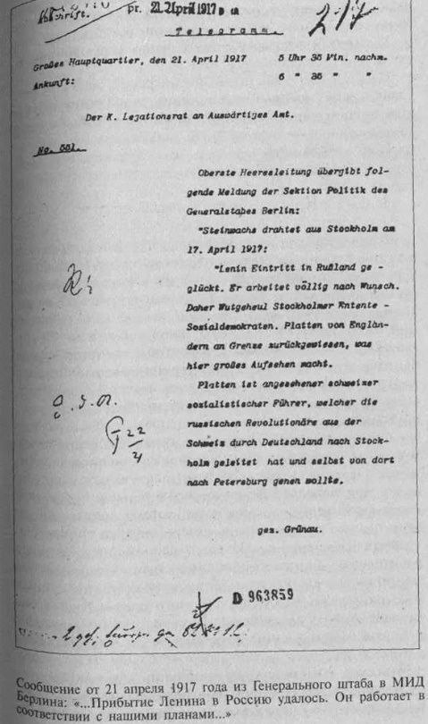 В целом ряде книг антиленинского содержания, где "доказывается", что Ленин немецкий "шпиён", приводят очень короткий документ. Это телеграмма в МИД Германии от её представителя в Главной ставке верховного командования, в которой приводится телеграмма с донесением руководителя немецкой разведки в Стокгольме о приезде В.И. Ленина в Россию. В телеграмме 4 предложения.