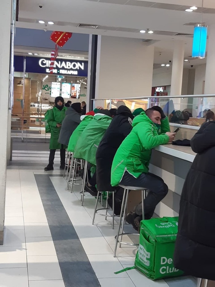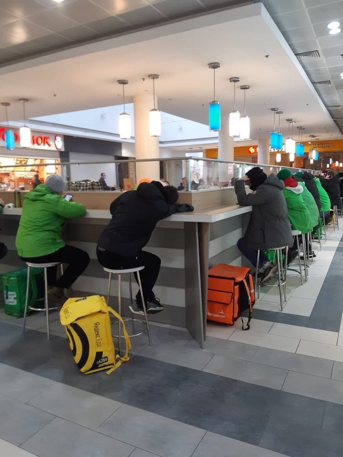 Видимо, у доставщиков не было заказов, поэтому они больше часа просидели за столами в фуд-корте. Ещё несколько работников стояли у входа в ТЦ.