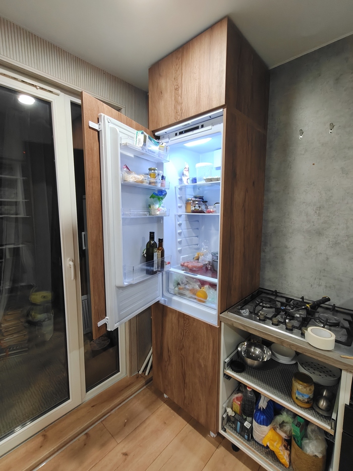 * Большая рабочая зона 125см. Плита и мойка по краям рабочей зоны, холодильник в колонне слева. Не смотря на то что холодильник, плита и мойка должны быть в треугольнике, а не встык, пользоваться вполне себе удобно. Хотя я спрашивал у них, на счёт этого треугольника. Мойка и плита сказали что никому ничего не должны, а холодильник вообще нахуй постал.