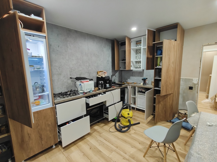 Ну и немного фото процесса, который отсылал жене, пока она отдыхала в санатории. На всё про всё ушло 2 недели от заказа ЛДСП, до финала. В процессе вылез один значительный проёб и пара не значительных, на которые можно забить хер, а можно не дорого переделать, по завершении более насущных дел