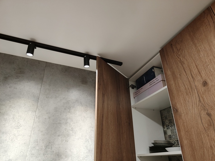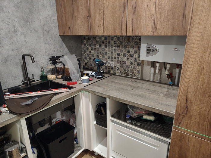 * На короткой стороне кухни под навесными шкафами стоит ЛДСП в цвет фартука он съёмный для доступа с котлу и розеткам. На самой же столешке стоит повседневная техника, разгружая рабочую зону.