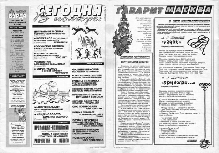 6 CEKCTAHT 2 года назад Газеты и журналы Серия Красная Бурда Красная Бурда - 1997 - 06 (47) Показать полностью 11 Журнал Красная бурда Юмор Ирония Длиннопост Скан 1997 Грустный юмор Ещё 0