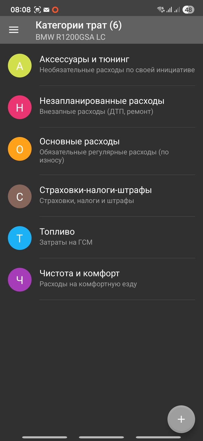 Поэтому первым делом залезаем в "категории трат". Это те самые сегменты, что составляют кольцо на предыдущем скриншоте. Только вы решаете, насколько подробно вы хотите записывать. Хотите только "техобслуживание" и "незапланированный ремонт" - сделайте так. Вы не обязаны записывать каждую заправку, как это делаю я: