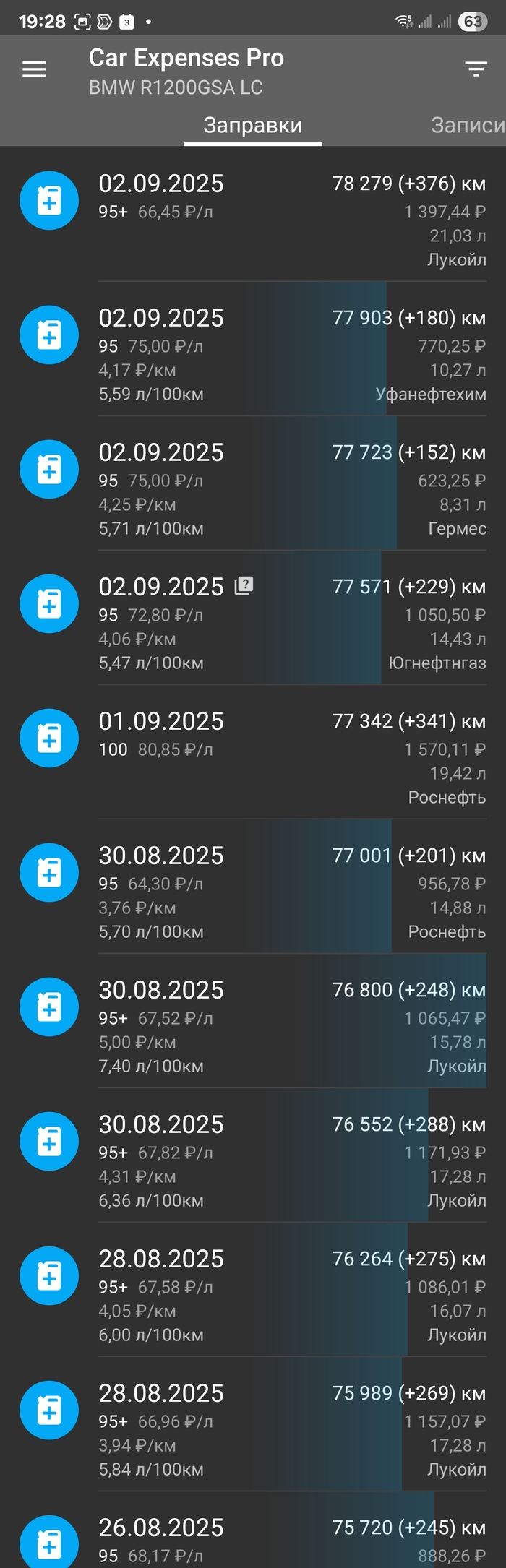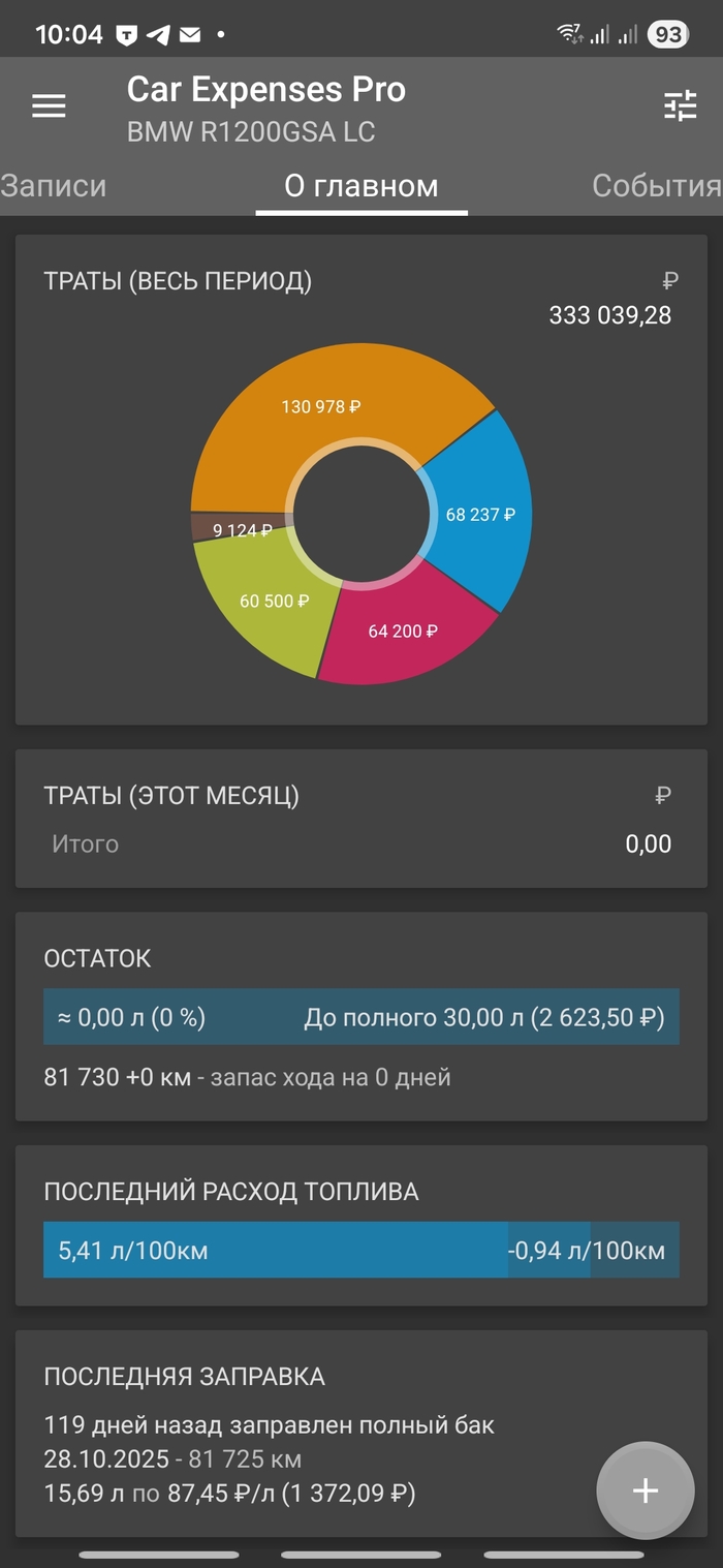 Это вкладка "Заправки", где речь только о топливе. А ещё это заправки из поездки "Три моря". Если вести их учёт, приложение само посчитает расход и покажет графикой, насколько он большой. Повторюсь, вы не обязаны. Можете хоть каждую мойку записывать, хоть только техобслуживание.