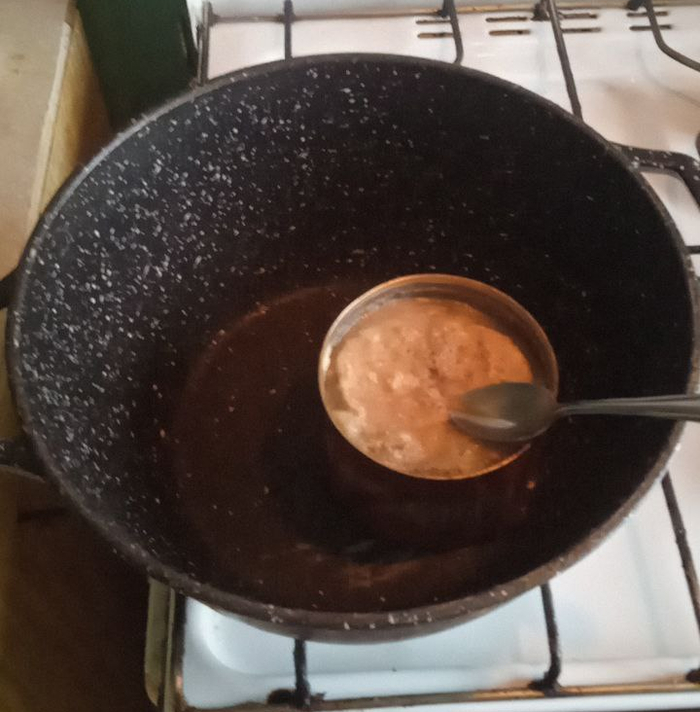Теперь начинаем готовить. В кастрюлю с толстыми стенками (казан, котелок) закидываем тушёнку. Поскольку она нам нужна жидкой, а не кусками, используем для выкладывания чайную ложечку.