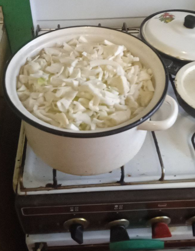 Вроде всё есть, не хватает только шампиньонов, но уж чего нет - того нет... Во-первых, кромсаем и отвариваем капусту.