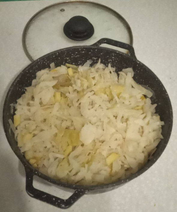 Затем кладём тыкву, картофель и отваренную капусту. После чего оставляем на слабом огне на 35-40 минут.