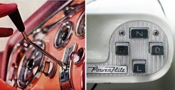 В 1954 году Powerflite управлялся с помощью обычного рычага на рулевой колонке. Однако не было положения «парковка», вместо этого на хвосте коробки был установлен барабанный тормоз, управляемый отдельным рычагом. В 1955 году селектор был перемещен на приборную панель (фото ниже) на один год, а в 1956 году было введено кнопочное управление, фирменная черта Chrysler на долгие годы вперед.