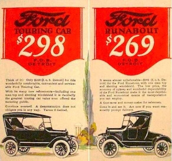 Однако поразительная цена в $269 за двухместный Runabout или $298 за пятиместный Touring не была полностью обусловлена чудом массового производства. Рекламируемая цена была занижена за счет того, что Model T была полностью "раздета": в нее не входили электростартер, запасное колесо или коврики. Электростартер был доступен за дополнительные $65, и более 80 процентов покупателей Ford в том году предпочли доплатить, а не заводить двигатель вручную.