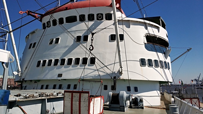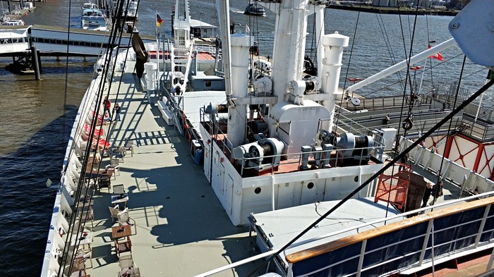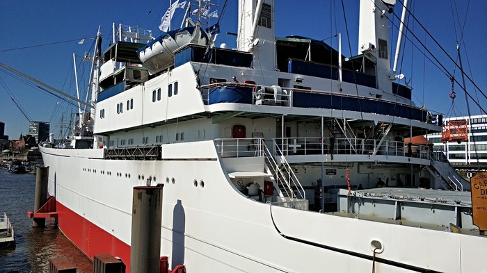 Следующей остановкой станет судно Кэп Сан Диего, построенное в 1962 году в том же Гамбурге. За 20 лет судно совершило более 120 рейсов между Европой и Южной Америкой, потом было продано испанской компании "Ябарра", которой эксплуатировалось до 1986 года. После чего было продано на слом. Однако, Гамбург выкупил судно, отреставрировал, поставил на набережной и теперь это музей и отель.
