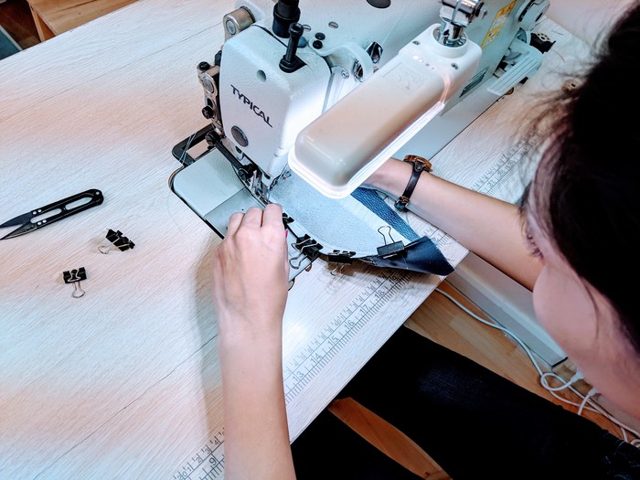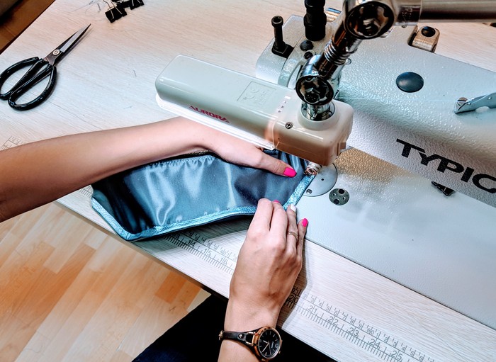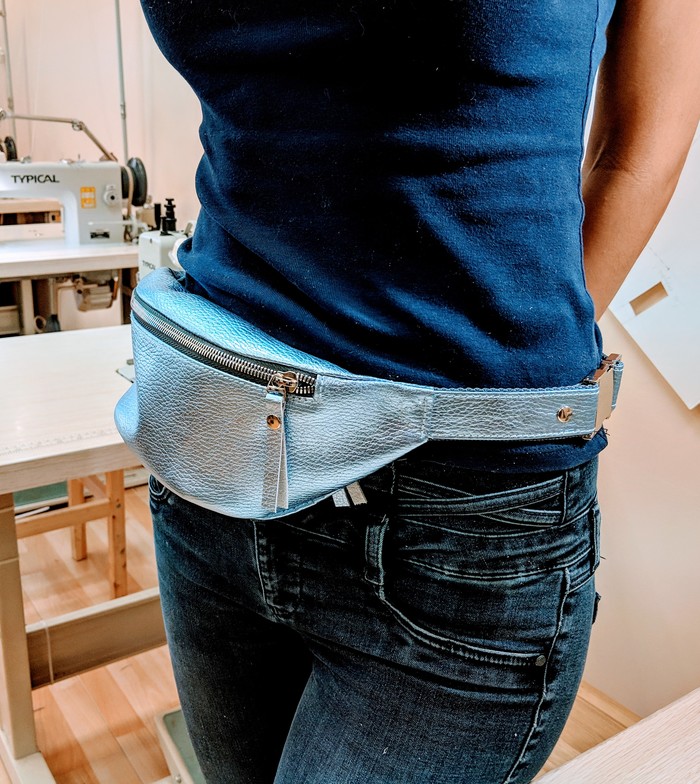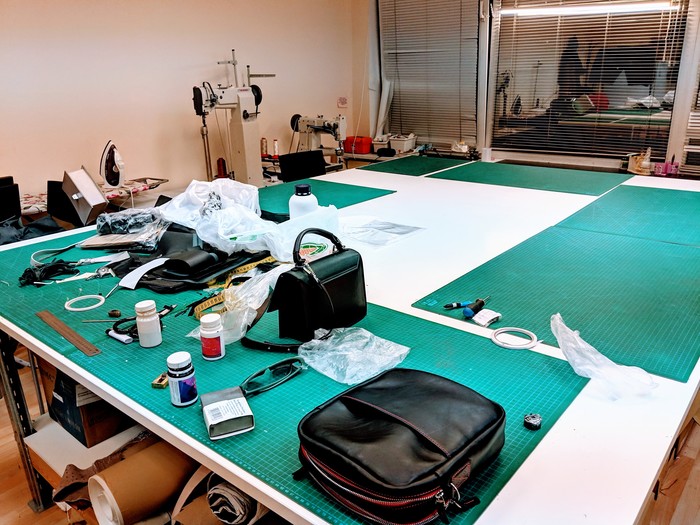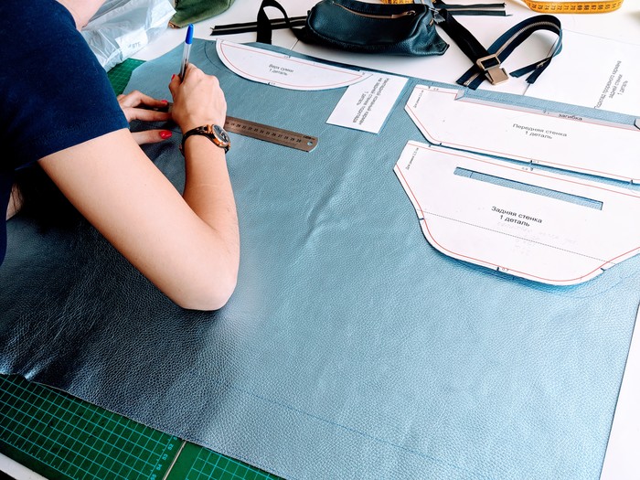 Юля сегодня шьёт поясную сумку по готовым лекалам, она должна уложиться в один десятичасовой рабочий день. Я готовлю лекала и образец.