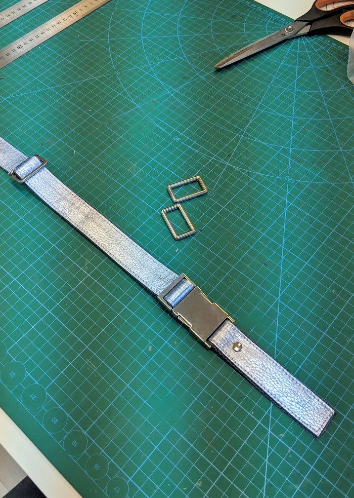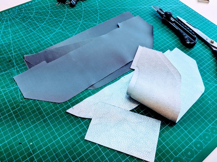 Для начала - разметка лекал на коже и раскрой. В общем, ничего хитрого, но для неопытных рук отнимает прилично времени. Обычно мы размещаем специальным серебряным стержнем.. но на серебряной коже серебряного стержня не видно, и мы плебейски переходим на синюю шариковую ручку.