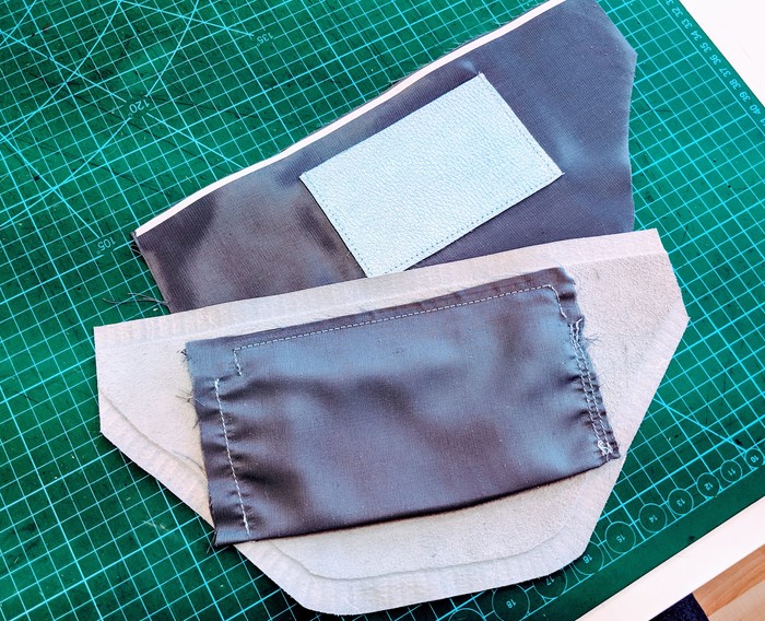 Тем временем Юля раскроила кожу и подклад. Мы обрабатываем края кожи и готовы начинать шить.