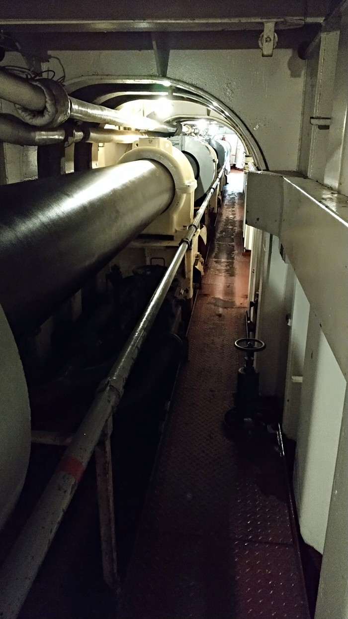 По этому длинному узкому коридорчику можно протиснуться из машинного отделения к самой корме. Большой металлический вал крутит винт теплохода