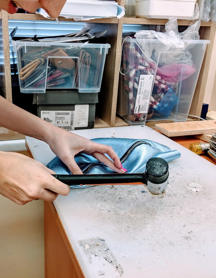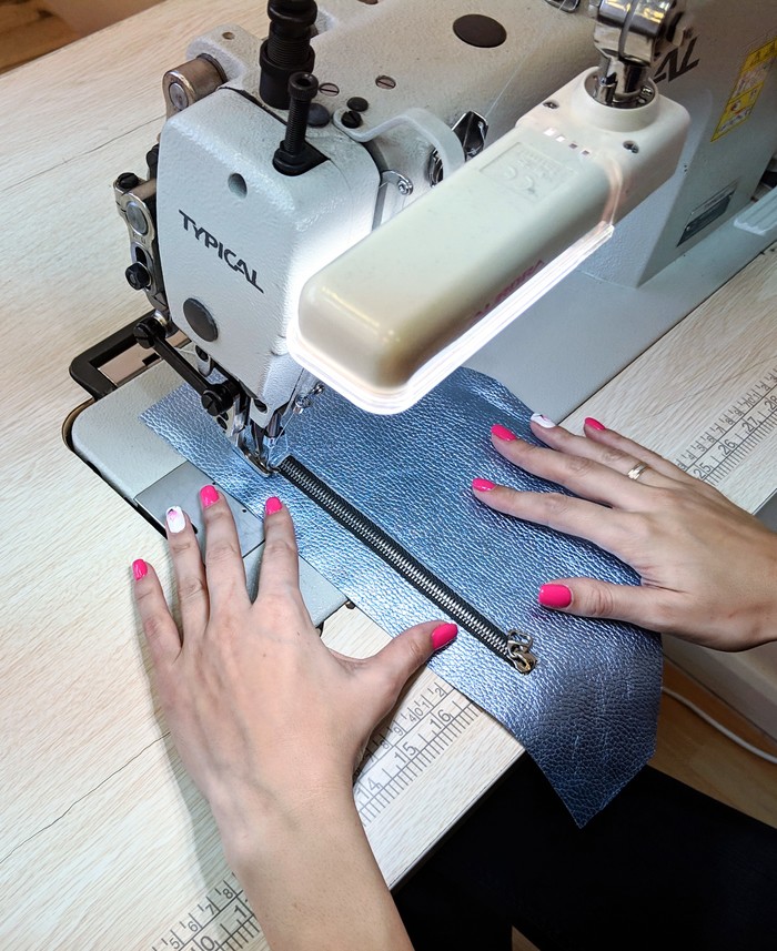 Юля никогда не работала с кожей и шила за машинкой только фартук в школе. Но это не беда, большинство студентов не имеет никакого опыта. А вот молнии, которые она принесла, очень короткие и не подходят. Поэтому я ныряю в ящик с обрезками и нахожу очень приличный кусочек молнии подходящего цвета. А бегунки можно снять с принесенных ею молний