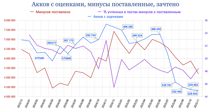 Из 101 380 постов, написанных в ноябре, имели рейтинг выше 10 000 - 120, от 5 000 до 10 000 - 690 (0,7%), от 1 000 до 5 000 - 4 990 (5,2%), от 100 до 1 000 - 15 685 (16,3%), от 0 до 100 - 58 339 (60,6%), с отрицательным - 16 435 (17,1%).