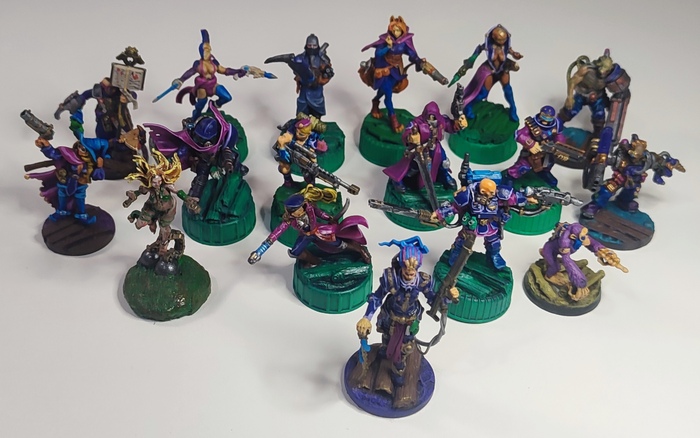 Все подставки обмазаны текстурной пастой и выкрашены в зелёный, чтобы выглядели как трава на земле. Получилось аляповато, сами чумоносцы на их фоне блекнут. Но в целом эти парни мне очень нравятся.